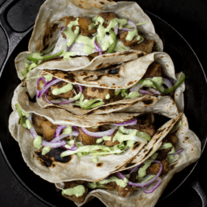 - Assemble the tacos by placing on some lettuce, potatoes, sliced red onion, sliced jalapeño, fresh cilantro on a warm, soft tortilla. Drizzle with the aioli and enjoy.