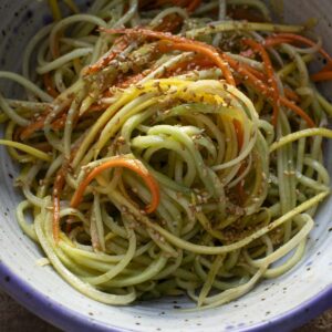 One important thing to remember with this salad is to only prepare the vegetable noodles when you are ready to serve. They do not like to sit for too long and will become soggy once they are combined with the dressing, so make this right before serving. Next, you can make the dressing in the same serving bowl. Simply prepare the dressing and then carve the noodles and add them to the bowl. Toss to mix and you are ready to serve.