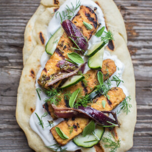 - Once the bread and tempeh are done, it’s time to assemble the flatbreads. Spread a thick coat of yogurt on each piece of bread. Add the tempeh and onions. Next, add the sliced cucumber and fresh herbs. Don’t skimp on the herbs! They really make the dish. Squeeze fresh lime juice over top and sprinkle with salt and pepper to finish. Enjoy!