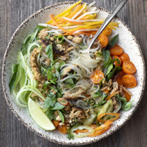 There is nothing more satisfying than a bowl full of noodles, especially when it’s loaded with big bright flavors and lots of interesting textures. This vermicelli noodle bowl, inspired by the classic Vietnamese dish Bún thịt nướng, is something that I crave often, especially in the summer when it’s hot as hell. There are many different types of vermicelli but I especially love using the glass noodle variety for this dish. These are made from different vegetable starches and have a delightfully chewy texture. Once coated with a refreshing dressing, tossed with loads of fresh herbs like Thai basil, mint, and cilantro, and combined with a hearty and savory protein like soy curls, you are left with a beautifully wholesome and filling meal. Of course, crispy onions and roasted peanuts sprinkled over top make this dish truly divine.