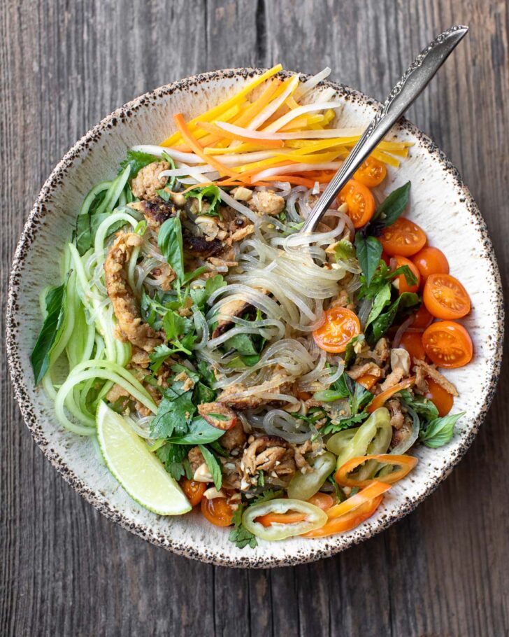 - Serve: At this point, you can transfer the noodles to a serving dish and top with the crispy onions, peanuts, and a final squeeze of lime juice and serve the salad as is. Or you could assemble it as a bowl by piling a good amount into an individual serving bowl and adding as many of the optional toppings as you'd like: julienned carrots, cucumber, halved cherry tomatoes, thinly sliced sweet peppers, etc. To finish, sprinkle with peanuts and crispy onions and serve with a lime wedge. Enjoy!