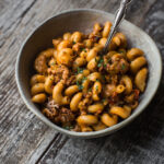 Reduce heat to medium and add the sausage and garlic. Break up the sausage into a crumbly texture. Cook for a few minutes, stirring often, to caramelize the garlic and brown the meat. Add the paprika, chipotle chili powder, pinch cayenne, onion powder, garlic powder, nutritional yeast, thyme, sage, and oregano. Cook for a few more minutes to toast the herbs, stirring often.